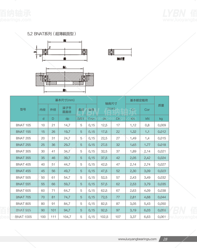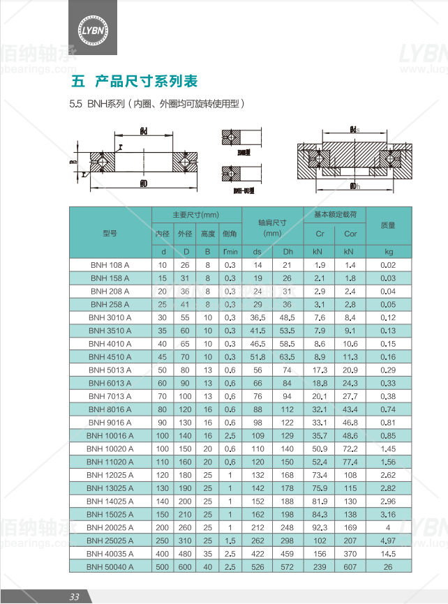 洛陽佰納BNH型交叉滾子軸承:內(nèi)圈和外圈均為整體結構,此系列是薄截面整體系列,外形尺寸與BNB/BNE系列完全相同,
