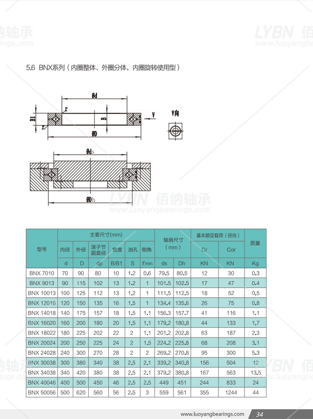 洛陽佰納BNX型交叉滾子軸承:內(nèi)圈整體、外圈分體結構,在相同的軸頸情況下,此類型比BNH系列有更小的截面尺寸,采用德