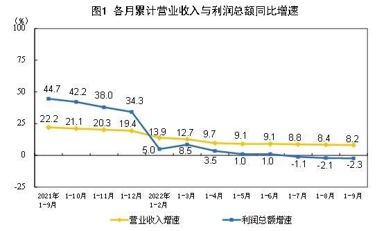 1 — 9 月份,全國規(guī)模以上工業(yè)企業(yè)實(shí)現(xiàn)利潤總額 62441.8 億元,同比下降 2.3% 。