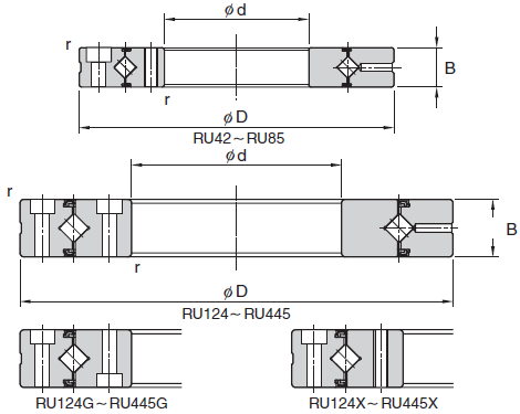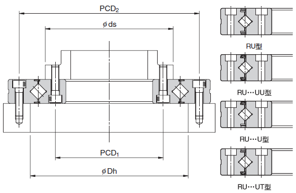 | 90 | RU 148X | RU148XUU | 4.9 | 90 | 210 | 25 | 1.5 | 112 | 12-M8貫通 | 187 | 12-φ9貫通,φ14襯孔深度8.6 | 133 | 162 | 49.1 | 76.8 |